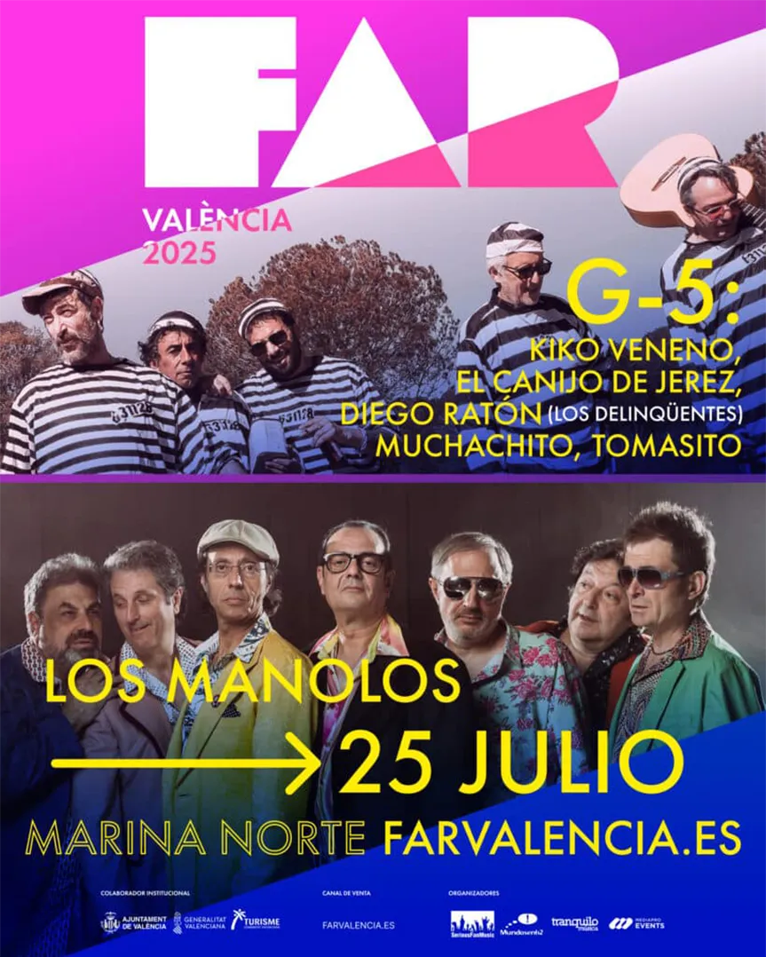 • 🎉 G5 y Los Manolos (25 julio): noche festiva junto a Kiko Veneno, Tomasito, El Canijo, Muchachito y Ratón.